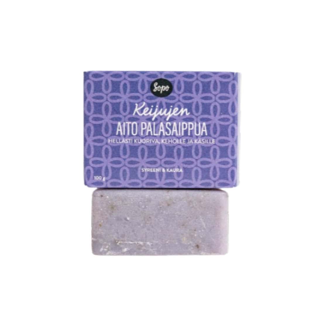 Sopo Keijujen Aito Palasaippua on perinteisin menetelmin valmistettu palasaippua, joka puhdistaa luonnollisen hellävaraisesti. Sopo Keijujen Aito Palasaippua tuoksuu huumaavalle syreenille. Syreenin tiedetään olevan supistava eli astringoiva ainesosa, joka on ihanteellinen ikääntymisen merkkien ehkäisyyn, ihon elinvoimaistamiseen, aknen hoitoon ja selluliitin vähentämiseen. Syreenillä on myös antibakteerisia ominaisuuksia. Keijujen Aito Palasaippua on siis oikea taikasaippua!